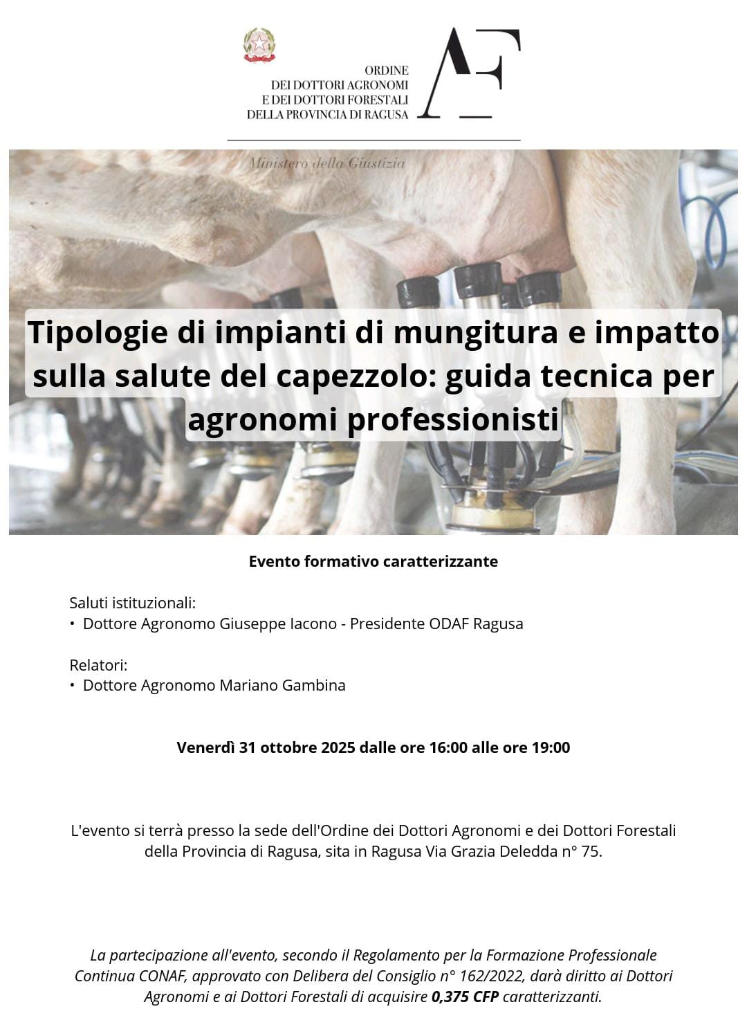 Il Consiglio Territoriale ha organizzato, per venerdì 31/10/2025 dalle 16:00 alle 19:00, il convegno in oggetto che si terrà presso la sede dell’ordine dei Dottori Agronomi e dei Dottori Forestali della Provincia di Ragusa sita in via Grazia Deledda 76, Ragusa (RG).